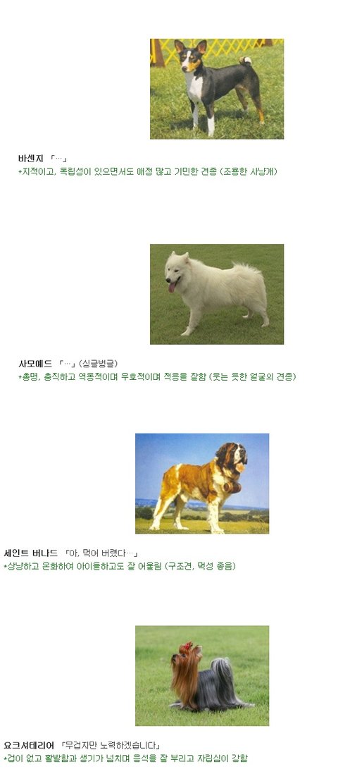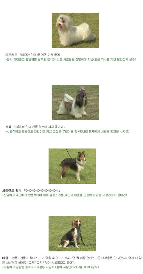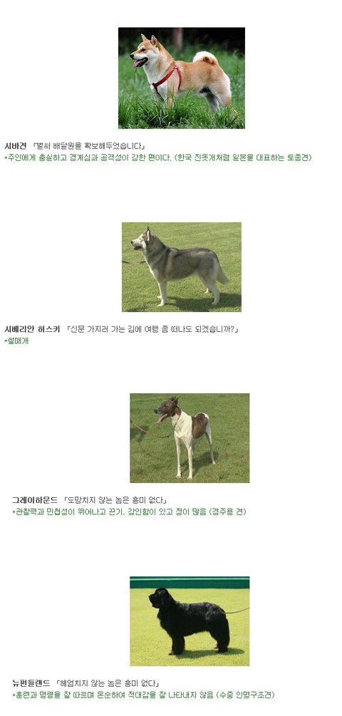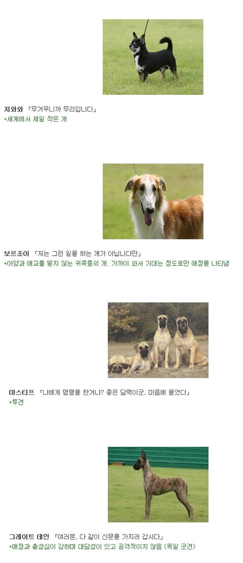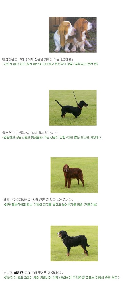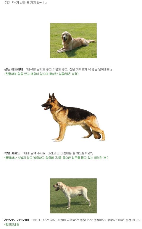 "신문 좀 가져와!" 했을 때 개들은 견종에 따라 이런 반응을 보인다고 합니다. 일본 커뮤니티 사이트 2ch에 올라왔던 내용을 한 누리꾼이 번역해 놓았네요. 각 견종의 특징이 한눈에 들어옵니다.