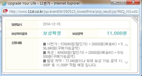 그러자 고갱뉨 저의 11번가는 최저가 보상제 110%가 적용되어 보상 받으실 수 있습니다 이러대요