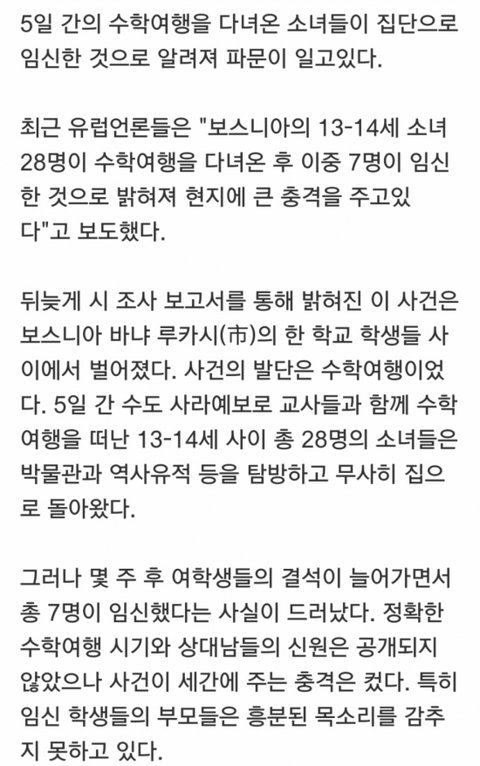 수학여행 다녀온 여학생들 집단 임신