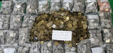 상자 안에는 '구겨지고 녹슬고 때 묻은 돈, 좋은 곳에 쓸 수 있다는 의미는 무엇일까요?'라는 손글씨 메모와 함께 1백15만5천 원의 동전이 가득 담겨 있었다.