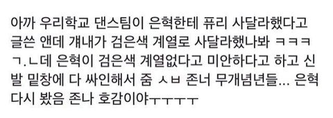장난식으로말할수가없는게 사이즈적을때 충분히 장난이라고말릴수있는건데진짜사줄줄몰랐다고?웃긴다ㅋㅋㅋㅋ그리고 초콜릿 사탕받은게부러우면 적당한걸 사달라하던가인간적으로 퓨리가뭐냐? 퓨리싼게 16~19만원이고 비싼게30만원인데지들신을신발을 아이돌한테뜯는건처음이다 ㅋㅋㅋㅋ