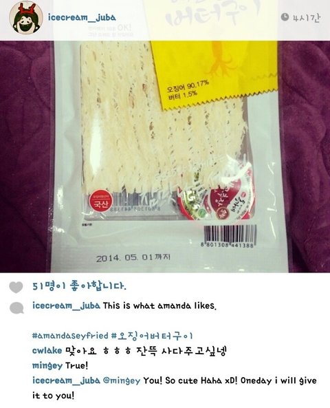 아만다가 씹는것을 좋아한다고 해 준비한 버터구이 오징어 선물.