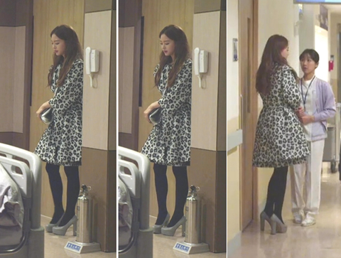 호피 코트에 각선미 드러내고 그레이 통굽 구두 신었는데