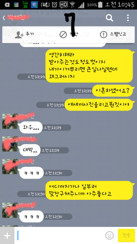 자식사진을 프로필로 해놓은채 그런 대화를 했고 외도를 바라는 그런뉘양스로 대화를 하기에 이혼했냐고 내가이거내용뿌리면 큰일나실텐데 왜그러냐고 욕을하니 그쪽에서 대박이라고 이럴줄알았대요ㅋㅋㅋ 순진해보이진않았다그러면서 자기가 콜박스파? 무슨그런얘기하면서 사시미로 절찌른다는둥 머리를 아작내서 잘근잘근씹겠다고 협박을 합니다. 그래서 저도 신고를 하려하는데요 어떻게하는게 좋을지요ㅜㅜ 회사에 뿌리면 오히려 제가 고소당하나요?