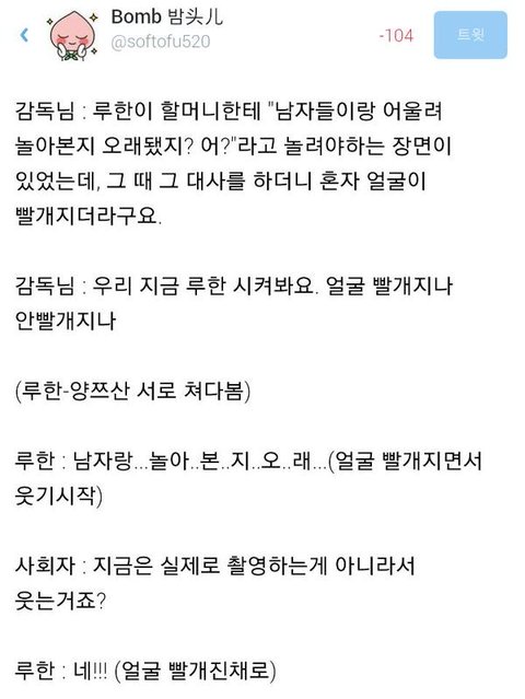 하나더있는데 감독님이루한이대사할때마다 얼굴이빨개졌데 그래서 사회자가 왜그랬어요?하니까