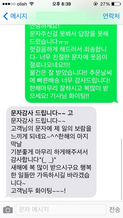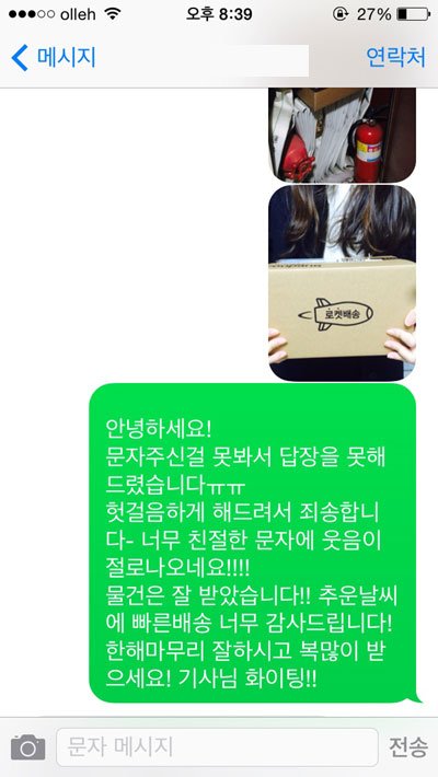 무사히 받았다는 인증샷과 함께 감사하다는 문자를 보내드렸습니다.