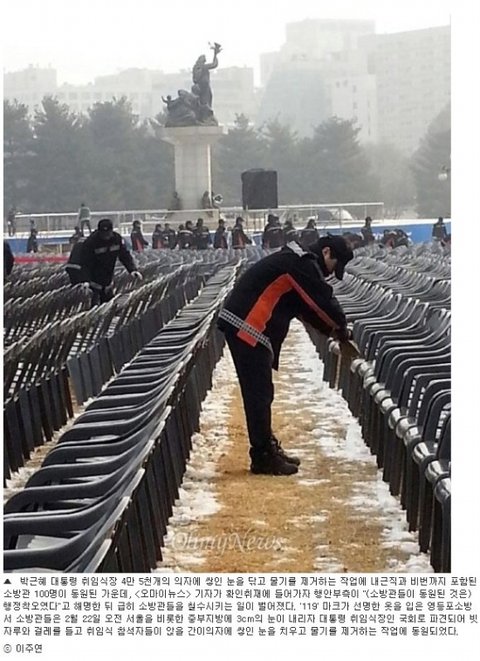 근무가 없는 비번 소방관까지 소방관 100명이 대통령 취임식장에 동원되어 한 겨울에 의자 4만 5천 개를 닦기까지