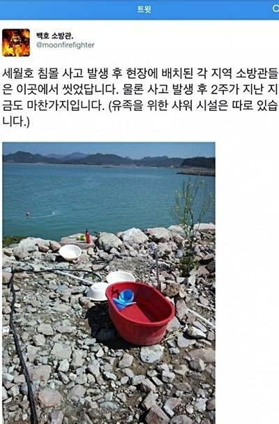 세월호 참사 현장에서 돌바닥에서 바가지로 물 퍼다 샤워하는 소방대원들