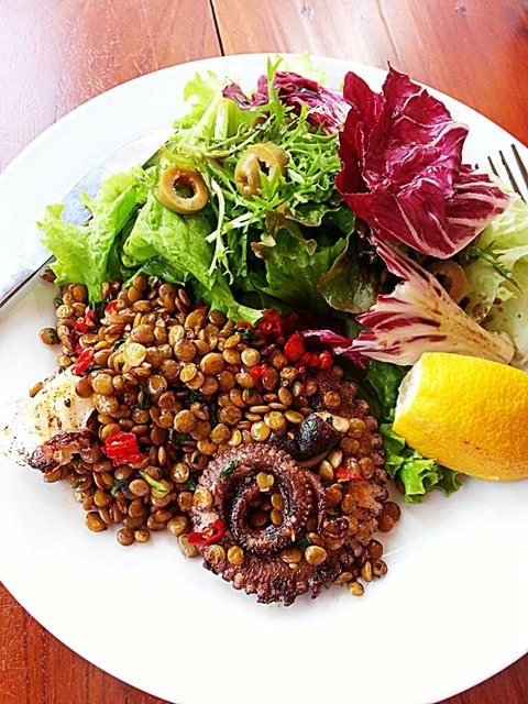 <구운 문어와 렌틸콩 그리고 샐러드> 삶은 문어는 팬에 바삭하게 굽고 삶은 렌틸 콩은 매운 고추랑 소금 후추 간해서 한번 더 볶아 주고 샐러드에는 그냥 올리브유랑 발사믹. 이건 발리의 포시즌 호텔 레스토랑ㄹ 갔을때 먹어 봣는데 거긴 샐러드 대신 정말 기름진 감자를 줘서 좀 바꿨어요.