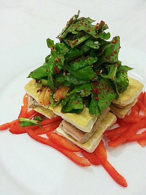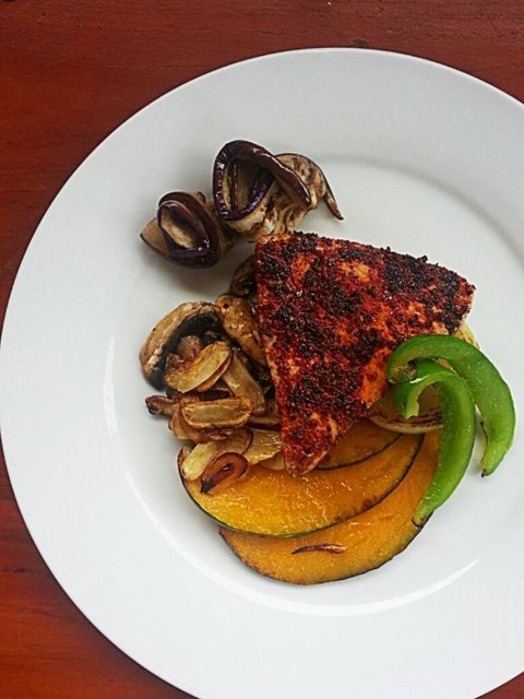 <고추가루 입힌 참치 스테이크> 매운 것 먹고 싶은 병. 여기 음식도 삼발이라고 고추 갈아서 향신료 넣어 만든 것 있는데 성에 안차나봐요. 참치를 구울때도 고추가루를 입혀서 구웠는데 탔어요 살짝. 우어어