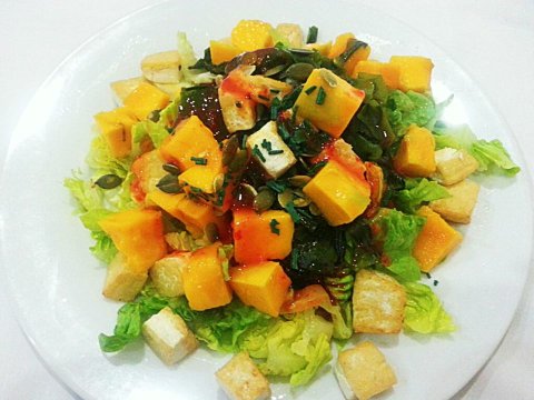 <칠리소스 망고 샐러드> 이상해 졌어요. 한국 살때는 과일은 디저트였는데 망고에 칠리 소스를 뿌리는 과감한 시도. 그것도 밥대신. 깨알 같은 두부!