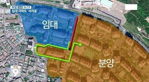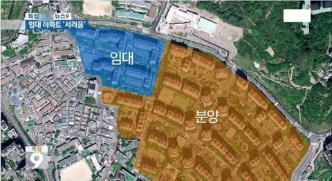 우리 아파트네. 지어진지 10년이 넘었고 철조망이 있고, 세대수가 제일 많은 아파트로 알려졌지만, 임대 아파트에 사는 사람들 대부분이 원래 여기 살았던 토박이들로 집내놓으라고 난리난리 쳤다함. 결국 임대 지어줬음. 그런데 실제로 10년 가까이 살면서 임대 친구들 얘기들어보면, 자기네들도 무서워서 밤에는 밖에 안나간다고 하고, 저기서 일어난 사건과 사고 얘기들으면 저 철조망이 있는게 비단 보이는 것 만큼 나쁜게 아님. 임대쪽 근처로 걸어갈때마다, 아빠가 아이한테 폭력행사해서 비명 지르는 소리 등등 들은게 한, 두번도 아니고, 저 철조망이 언제부터 있었는지 모르지만 내가 10년도 더 됐고, 철조망이 사라지지 않는거 보면 많은것이 반영되어 있다고 생각함. 차별일까? 글쎄.