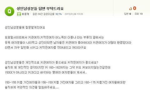 어떻게생각하냐고 물어봤는데 155아래는 너무작고 155부터 까지는 괜찮다,그냥 나보다 작으면 상관없다,여자면 다좋다 이런반응인애들이 더많았음 그리고 키취향 니생각엔 바뀔것같냐고 물어봤는데별로,잘모르겠음 이런식이었음 카톡으로 말한게아니고 대화하다가 얼핏 물어본말이라