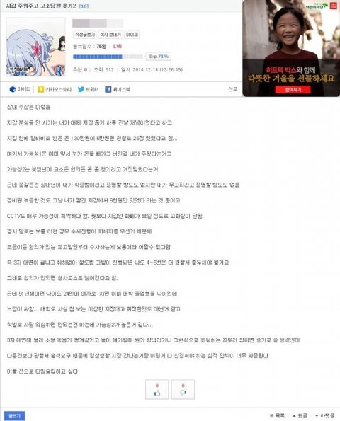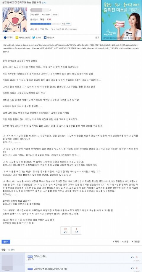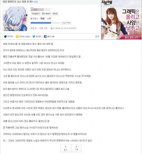 댓글러가 말했던 뽐뿌에 작년 7월에 올라온 원글 (모배있음) http://www.ppomppu.co.kr/zboard/view.php?id=freeboard&no=3626908&ismobile 사건 전개가 토씨하나 안틀리고 똑같음 다만 다른점은 뽐뿌 원글은 가해자가 50대아저씨 현재글의 가해자는 20대 초반 여대생... 여혐종자의 자작으로 의심됨 --------------------------------------------------------- 세 줄 요약 1. 루리웹에서 지갑 주고 고소 당했다고 글 씀 2. 어떤 유저가 의문제기 후 댓글 달려고 하자 광삭 3. 뽐뿌에도 같은 내용이 있었고 결국 주작 이토펌