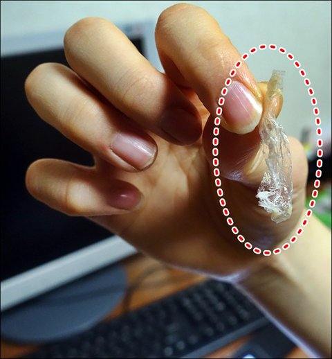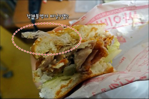 "언니!! 맘**치 버거안에 이거 뭐야? 이물질이지? 랩인가? 비닐인가?"