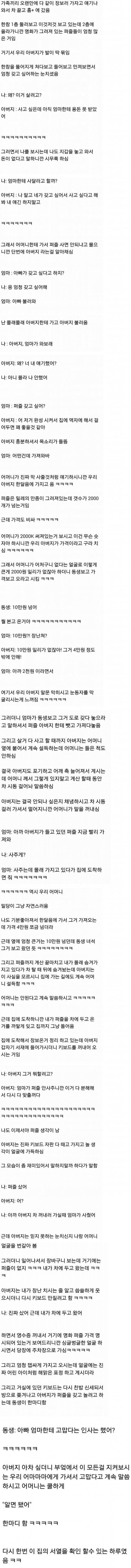 왜?? 귀여운데?? 나혼자 엄마미소지으면서 계속 읽었는데?? 저게 어딜 봐서 기죽인거야?? 기죽이는건 저거 사달라고 했을때 돈도 못벌어오면서 이런 쓰잘때기 없는건 머하러 사려고!! 이런거 사고싶으면 남들처럼 생활비 많이 주던가!! 이런게 기죽이는거 아님????