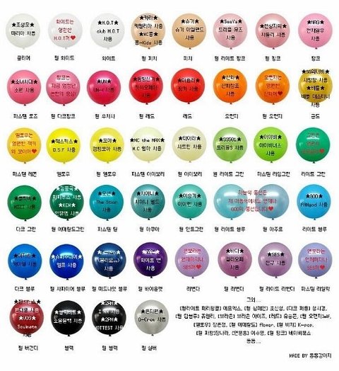 자세히 보면 색깔들이 조금씩달라요 하지만 컴컴한곳,콘서트장에서 응원봉색이 비슷해보일수도 있겠지만 아무튼 풍선색으로보면 다릅니다.