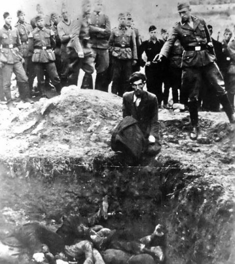 시체로 채워진 구덩이 앞에 한 유대인 남성의