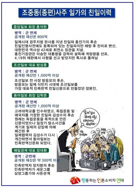 홍진기라는 사람이 중앙일보 홍석현 회장의 아버지임. 일제강점기에 판사 였으며, 친일파로 친일인명사전에 등록되어 있슴. 홍진기는 해방후 이승만에게 달라붙어 살아남았는 데, 법무부 장관과 내무부 장관을 지냄. 홍진기는 법무부 장관으로 있으며 이승만에게 계엄령을 건의했고, 4.19가 일어나 경찰이 시민에게 발포했을 때, 경찰을 지시하는 내무부 장관이었슴. 4.19로 세상이 뒤집어진 후 붙잡혀 사형선고를 받았는 데, 손을 써서 빼낸 게 삼성 이병철임. 이병철이 홍진기를 빼낸 후, 돈을 줘서 만든 게 중앙일보. 현재 중앙일보는 홍씨네 거로 알려져 있지만, 사실상 아직도 삼성 이씨네가 주인임. 김용철 변호사가 이건희의 지분을 홍씨 명의로 위장해놓고 여전히 소유하고 있다 라고 폭로하기도 했었음. 재밌는 게, 홍진기가 장관으로 있으면서 폐간시켜 버린 게 경향신문ㅋㅋㅋ 경향신문은 나중에 부활했고, 홍진기는 중앙일보를 차렸으니, 두 신문은 악연이 깊지. 홍진기는 단순히 이병철의 얼굴마담이 아니라 기득권 세력의 한 축이었는 데, 자신의 자식들을 여기저기 시집보내 네트워크를 구성함. 홍진기는 박정희가 쿠데타를 일으키자 그 핵심인 중앙정보부장 신직수 와 사돈을 맺고 박정희가 죽고 전두환이 집권하자 안기부장 노신영 네에 다른 딸을 시집보냄. 이렇게해서 일제강점기, 이승만, 박정희, 전두환, 그리고 현재도 로열 패밀리로 살아가는 홍씨일가가 완성된거임. 정리하면, 홍진기의 맏딸 홍라희는 삼성 이건희의 아내이고.홍진기의 아들(홍라희의 동생)홍석현은 중앙일보 회장이며. 박정희때 중앙정보부장 신직수 집에 장가갔슴. 홍진기의 딸 홍라영은 5공 안기부장 노신영집에 시집갔고, 홍진기의 아들 홍석조는 검찰에서 고검장까지 지냄. 그리고 2008년 이건희-홍라희 부부는 딸 이서현이 동아일보 김회장네에 시집을감.사실상 중앙일보와 동아일보가 사돈이 되는순간...솔직히 대한민국 1위 기업인 삼성이 사실상 친일의 뿌리를 지녔다는게 쪽팔림...진짜...
