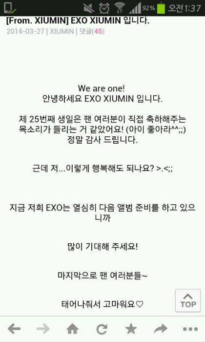 시우민이 생일날 한 말인데