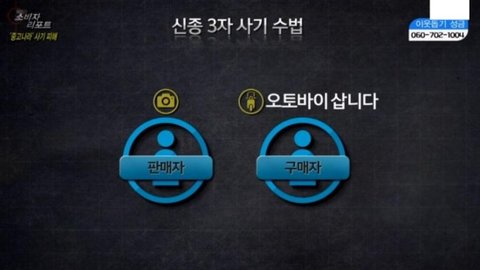 오토바이 구매자는 카메라 판매자에게 금액을 지불하고 카메라 판매자는 3자 사기범에게