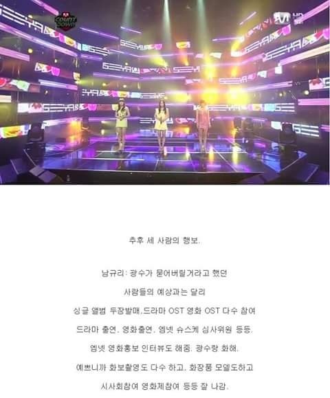 광수 이 미친새*는 하나같이 노래 잘하는 애들만 다 망쳐놨네 씨야하고 가비엔제이 여자 SG워너비로 라이벌 구도였을때가 엊그제 같았는데 진짜 세월참ㅠㅠ