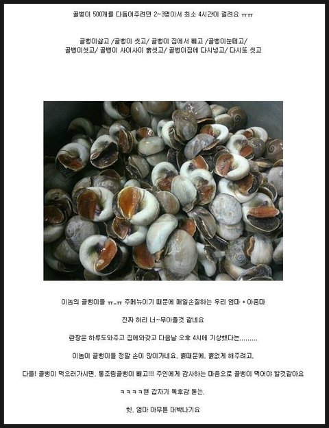 저도 엄마가게 놀러가면, 엄마가 "골뱅이손질하자" 라는말 나오면 도망갑니다