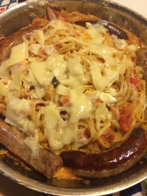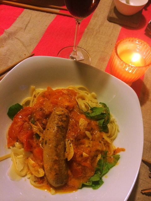 파스타 면을 직접 뽑아내는 것 빼고는 모두 홈메이드이라서 더 맛있는 소스가 넉넉한 토마토소시지 치즈 파스타! 전 좀 성격이 급해서 빨리빨리를 좋아하는데 시간과 공을 들여서 천천히 요리하는 신랑의 음식에는 그래서 더 깊은 맛이 나는 듯해요.