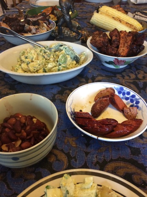 작년 4th of July에 화덕에서 직접 구운 소시지, 돼지갈비, 그리고 통닭! 역시 바베큐는 연기에 그을려 익혀야 제맛인 것 같습니다! 구운 옥수수와 감자샐러드와 함께 배가 터질듯 먹었죠.