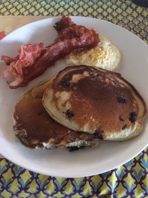 아침별미로는 집에서 직접 만든 블루베리 팬케익과 베이컨 그리고 계란 후라이! 블루베리 팬케익위에 메이플 시럽을 듬뿍 뿌려서, 커피와 함께하면 이보다 더 든든할 수 없지요!