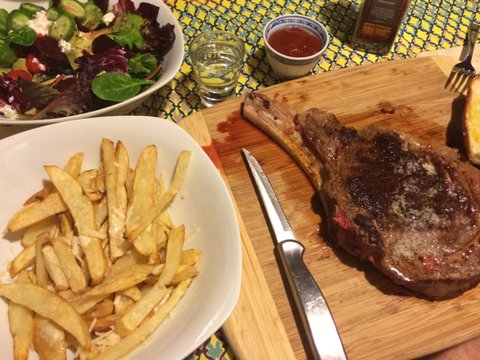 신랑의 스테이크를 맛본 뒤부터는 스테이크 레스토랑에는 잘 가지 않게 되었어요. 준비하는 것부터 구워서 먹을때까지.. 자신만의 비법이 있는데.. 진짜 어느 스테이크 레스토랑 못지 않게 부드럽고 맛있어요!! 게다가 집에서 만든 프렌치 프라이드도 호~ 바삭바삭하고 깨끗한 기름에 구우니까 깔끔한 맛이 나서 좋아요. 갓 구워진 프렌치 프라이드 위에 치즈를 얇게 슬라이스 해서도 먹죠!