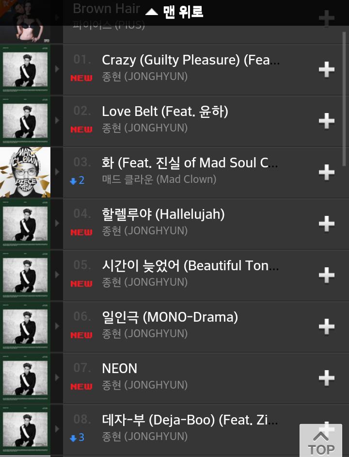 파란색과 보라색이 종현의 음원 성적입니다.