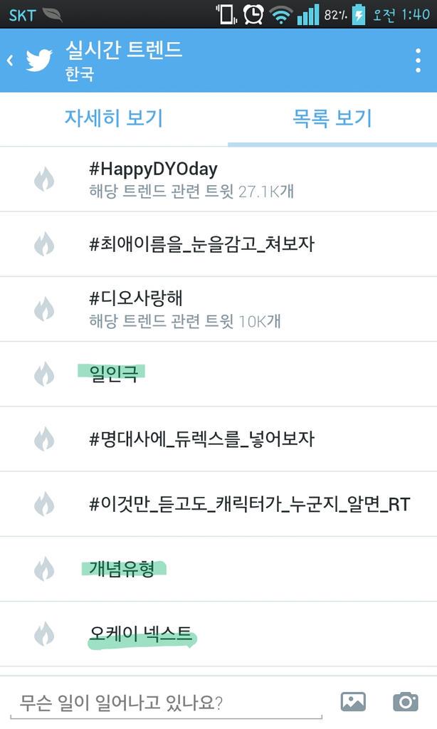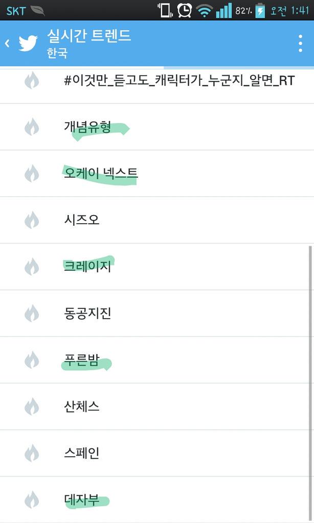 위의 두 사진은 트위터의 실시간 트렌드 키워드로, 현재 시간대에 국내에서 가장 많이 트윗되고 있는 단어들을 보여줍니다.