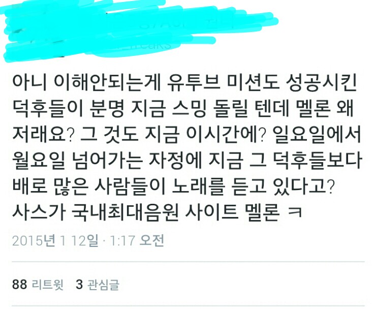 서양수박은 다운로드를 60%, 스트리밍을 40% 집계하여 차트에 반영합니다. 지금부터 아래 보여드릴 그래프는 음원이 공개된 자정부터 두시까지의 그래프들입니다. 팬들은 음원이 공개되자마자 당연히 엄청난 숫자로 음원을 구매할 것이고, 동시에 음원순위 향상을 위해 스트리밍 서비스를 이용합니다. 아무리 타가수들의 스트리밍 성적이 좋더라도, 다운로드 성적이 60%나 반영되는 멜론에서 1위를 차지하지 않았다는 것은 상식적으로 이해하기 힘듭니다. 또한, 위와 같이 팬들은 흔히 '스밍'이라고 부르는 것을 하는데, 이는 해당 음원을 계속 재생하여 스트리밍 횟수를 올리는 행위를 뜻합니다. 이같은 상황에서 정말 1위가 아니라고 확신할 수 있습니까?