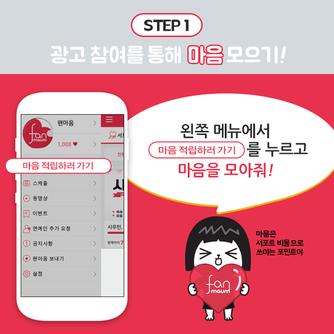 팬마음 어플다운 받아서 하면돼. 아이폰은 아직안된대.팬덤스쿨하고 같아 광고어플 다운받으면 마음포인트주는대 그걸로적립하면돼.