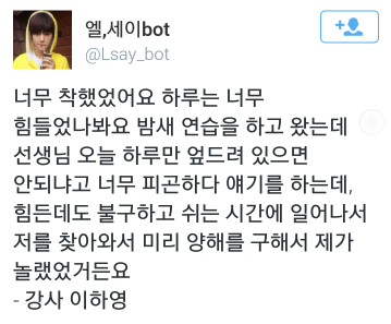 강의중 하시는 말 (대충 정리함)"활동 중에도 불구하고 엘군은 항상 눈빛이 초롱초롱하게 수업을 열심히 잘 들었어요 그래서 아마도 지금 이 위치에 설수 있는것 같아요.""가끔씩 연락이 오는데 힘든만큼 기쁨도 두배 세배 늘어난다고 말하더라구요.."