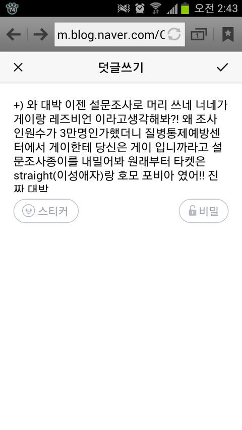'설문조사 방법이 이상한걸꺼야 길가는 사람에게 설문조사한다고 종이에 are you gay 라고 적힌 종이 들이댄건가ㅋㅋ'