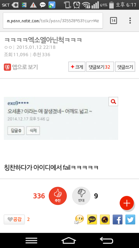 이거ㅇㅇ 지가 엑소엘 아닌 척 오세훈 칭찬댓글 달다가 지 아이디가 exo9뭐시기뭐시기라서 일코해제 됐다는 말 아님? 걍 베댓이 다 자작이니 뭐니 그런글이길래ㅋㅋㅋㅋ