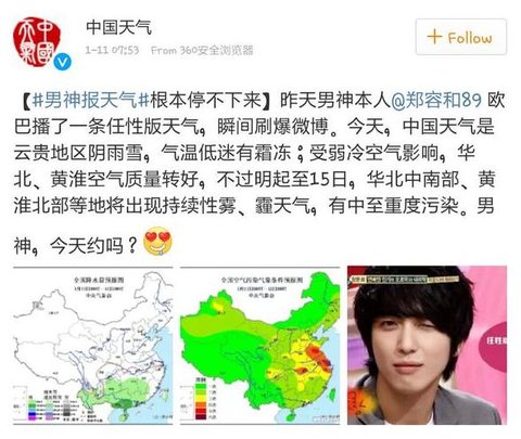 중국 기사청의 웨이보에서 일기예보 알려줄 때 날씨에 따라 정용화 사진을 응용함 ㅋㅋㅋ