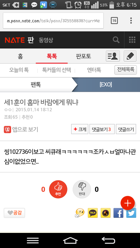 바람에게 걔 저 캡본있냐고 ㅅㅂ 미친년이 아무리 세훈찍덕이라지만 ㅈㄴ 너무한 거 아니냐 ㅋㅋㅋㅋㅋ 애정이 없네
