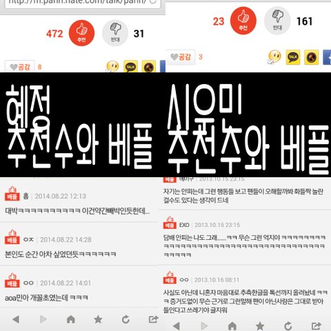 먼저 티아라. 왕따사건으로 지금까지 이미지 똥. 그런데 화영의 잘못도 밝혀지면서 티아라의 일방적인 사건이 아닌게 되었고 해명글도 막 올라옴. 그런데 사람들은 무조건왕따를 시켰다 이러면서 입에담지못할 악플.