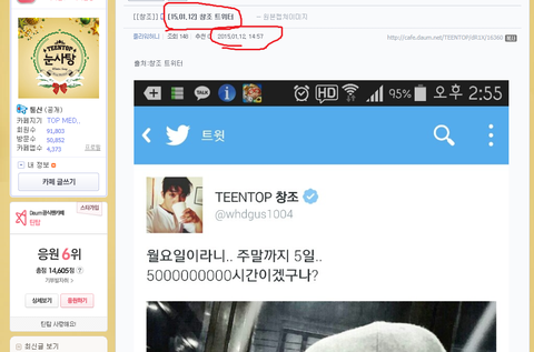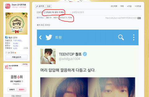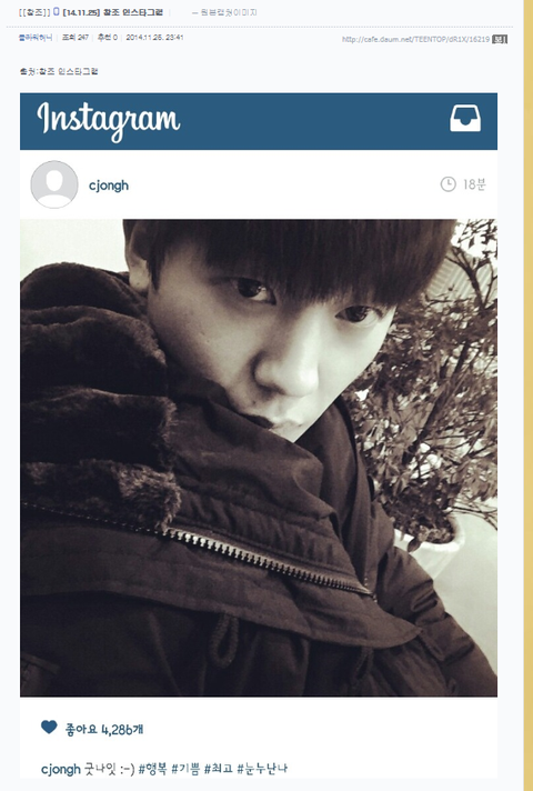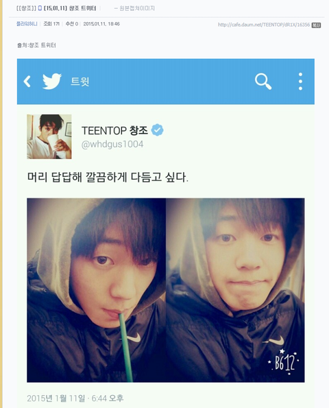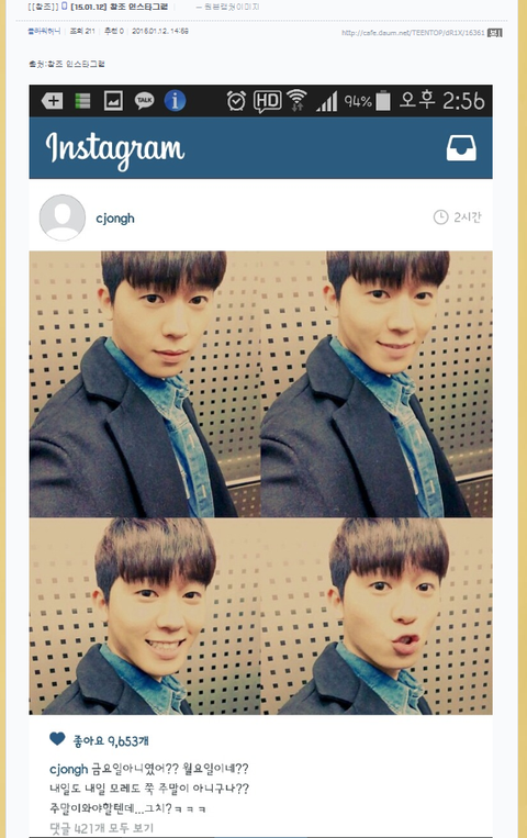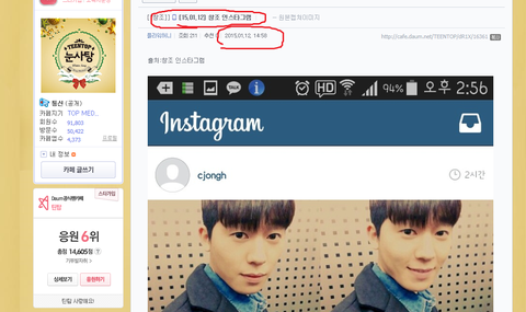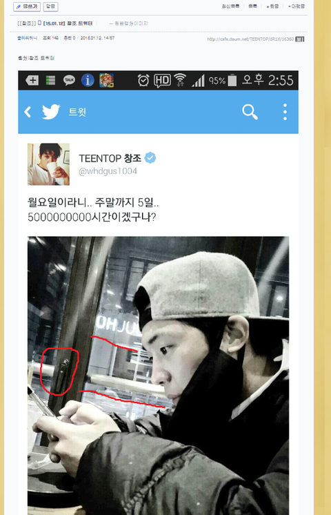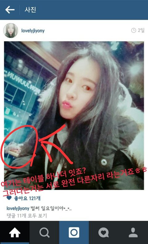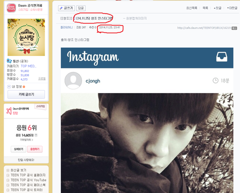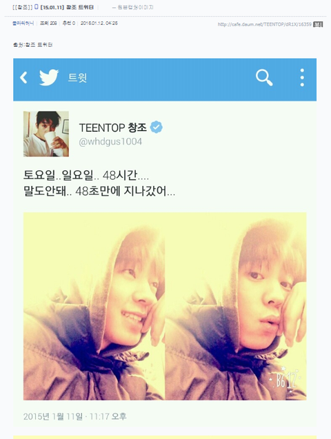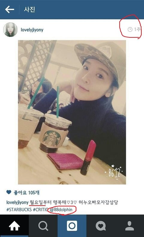 2015년 1월 11일입니다. 틴탑 멤버들 sns올리면 캡쳐해서 바로 공카에 올리는 거 다들 알고 계시죠. 그리고 2015년 1월 11일은 일요일입니다. 오늘은 14일, 11일은 불과 3일전입니다. 지연양은 최소 1주전 월요일에 스O벅O에 갔네요.