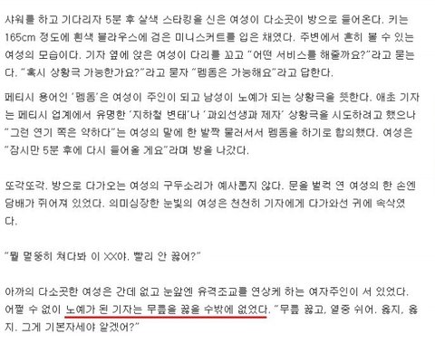 세줄요약 1. 기자가 변종성매매 잠입취재하러감 2. 펨돔밖에안됨 3. 기자살려!! 웃대펌