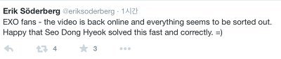 3. 엑소 팬들에게 - 비디오는 다시 온라인에 복구되었고 모든것이 처리된것처럼 보인다. 서동혁이 이것을 빠르고 정확하게 처리해줘서 기쁘다.