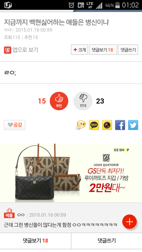 조용한 톡에 이딴 병신글 싸질러놓고 도배하면 그만?