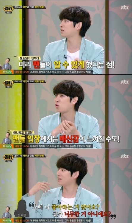 이어 박지윤이 "희철 씨는 (태연 백현 열애 사실)알고 있었죠?"라고 질문하자 김희철은 "한달 전에 미리 알고 있었다. 공교롭게 소녀시대에서 태연, 엑소에서 백현과 제일 친해서 미리 두 사람의 열애 사실을 알고 있었다"고 답했다.