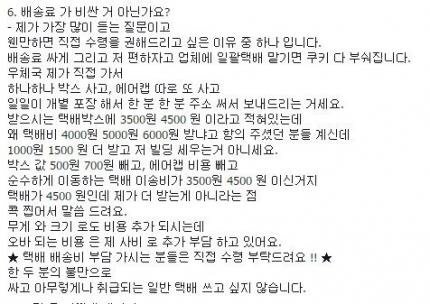 하나하나 박스사고 에어캡사고 주소쓰고...택배보낼때 당연한거아닌가? 진짜예전부터 느끼지만 당연한걸 되게 영광스럽게 알라는거같음 여신님이라 그런가...ㅋㅋㅋ뭐 우체국에서 직접부치면 쿠키인부서지고 일괄적으로 기사님이 받아가시면 다부서지낰ㅋㅋㅋㅋㅋㅋ진짜 조민아베이커리래서 조민아가 누구야이랬었는뎈ㅋㅋㅋㅋㅋ위생논란 시작해서 가격논란 품질논란 간판논란(?) 팬착취논란 카드부과세논란 ..정말 까도까도 계속나오는 양파같은 여신일세
