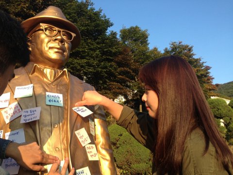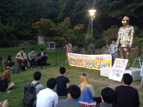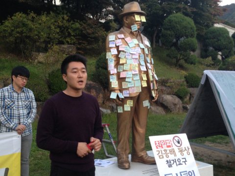 친일행적이 명백한 설립자 동상을 철거하기 위해 모인 대학생들이 재단의 후안무치 행정으로 인해 ‘부글부글’ 끓고 있다 한국외국어대학교 글로벌캠퍼스(용인) 학생들은 친일행적을 지닌 설립자 동상 설치 과정에서 재단의 일방적이며 폭력적인 행태에 분노하고 있다 본래 설립자 ‘동원 김흥배’의 동상은 이문동 서울캠퍼스에 세워질 예정이었다 그러나 서울 학생들이 동상 터를 점거하고 격렬하게 반대하자 재단은 동상 설립계획을 취소했다 그리고 재단은 여름방학을 이용해 기습적으로 글로벌캠퍼스에 동상을 설치했다 서울캠퍼스에서 버림받은 동상을 글로벌캠퍼스에 내다꽂은 것이다 학생들에게 한마디의 설명이나 동의 절차도 없이 말이다 무엇이 무서운지 동상 옆에 CCTV까지 설치했다 동상에 훼손을 가할 시 책임과 처벌을 묻겠다는 것 아닌가 캠퍼스의 주인인 8천여 학생들을 ‘잠정적 재물손괴자’로 치부한 행태이다 바로 이 점에 학생들은 더욱 분노하고 있다 학생들은 주인으로서의 권리를 찾고 힘을 보여주기 위해 행동에 나섰다 동상철거 실천단 ‘부글부글’을 만들어 온라인 홍보와 유인물 배포 서명운동, 학내 문화제 등을 진행했다 일주일 사이에 1천여명의 학생이 서명했다 하지만 재단은 이에 대해 모르쇠로 일관하고 있다 재단에 서명을 전달하며 학생들이 많이 분노하고 있다고 전했지만 재단은 미미한 수준의 일부 학생만 반대운동을 벌이고 있는 것으로 알고 있다고 답했다 아무리 눈과 귀를 틀어막고 있다고 해도 이렇게 어리석고 파렴치할 수 있을까?