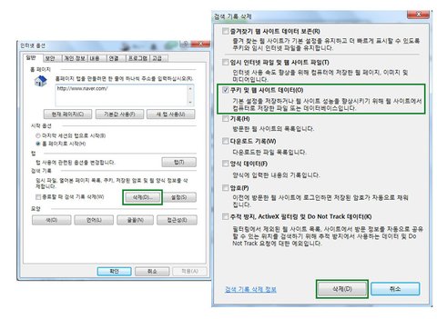 ④상단에 도구 클릭 -인터넷 옵션- 검색기록 삭제- 쿠키 삭제