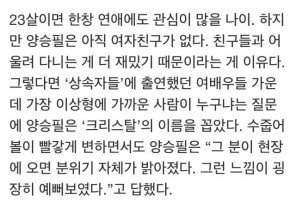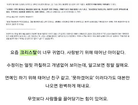 크리스탈은 없었다. 오해를 샀던 건 이 때문이었나 보다.진짜 크리스탈, 정수정은 어떤 사람인지 궁금했다. "평소의 안수정만큼 심하지는 않고, 그렇다고 극 중에서 청순한 척 연기했던 안수정만큼 여성스러운 건 또 아니에요